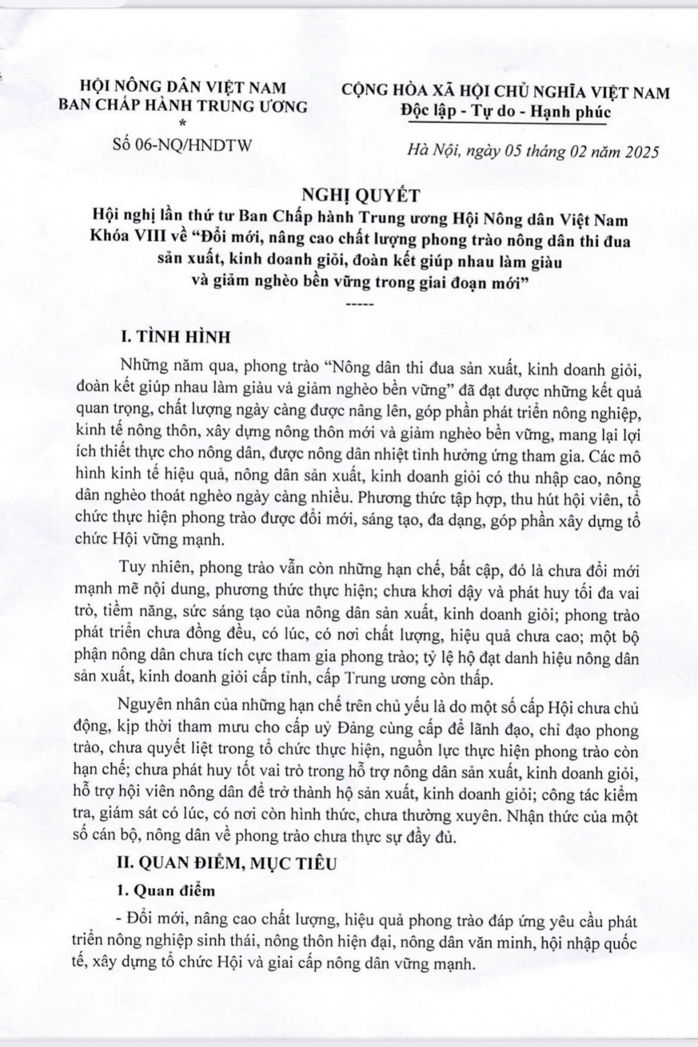 Nghị quyết số 06 ngày 05/02/2025 của Ban Chấp hành TW Hội Nông dân Việt Nam về "Đổi mới, nâng cao chất lượng phong trào nông dân thi đua sản xuất kinh doanh giỏi, đoàn kết giúp nhau làm giàu và giảm nghèo bền vững trong giai đoạn mới